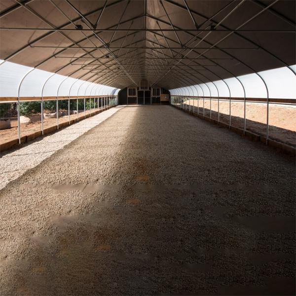 This greenhouse is covered with double layer plastic, the black-white film outside, and transparent PE film inside. The electric film rolling system can automatically roll up and down the film, and adjust the brightness in the greenhouse.